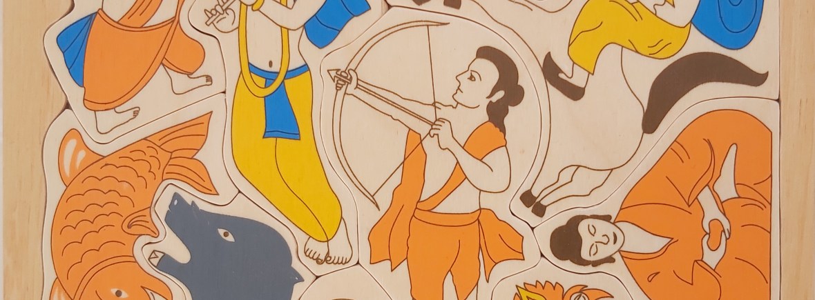 The idea is to introduce children to the ten major incarnations (avatara) of the Lord Vishnu in a very playful way.